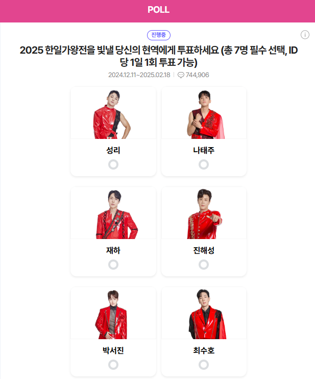 응원하고 싶은 7명의 가수를 선택해주세요. 투표는 총 7명을 선택해야만 완료됩니다. - 투표하기 완료